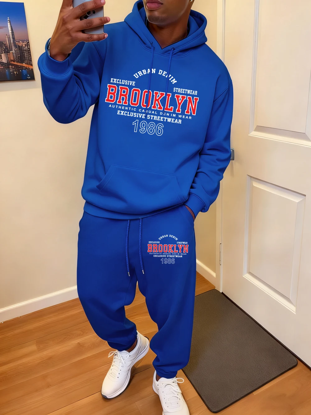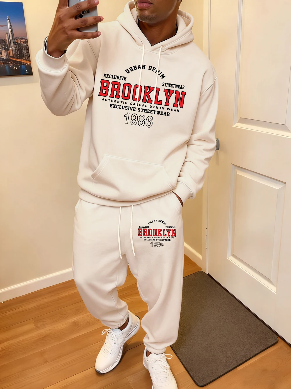 2 Pcs Hoodie Set Men Brooklyn Letter Simple Prints Sweatpants Sporty Fleece Warm Pocket Sweatshirt Pants Autumn Loose Clothes