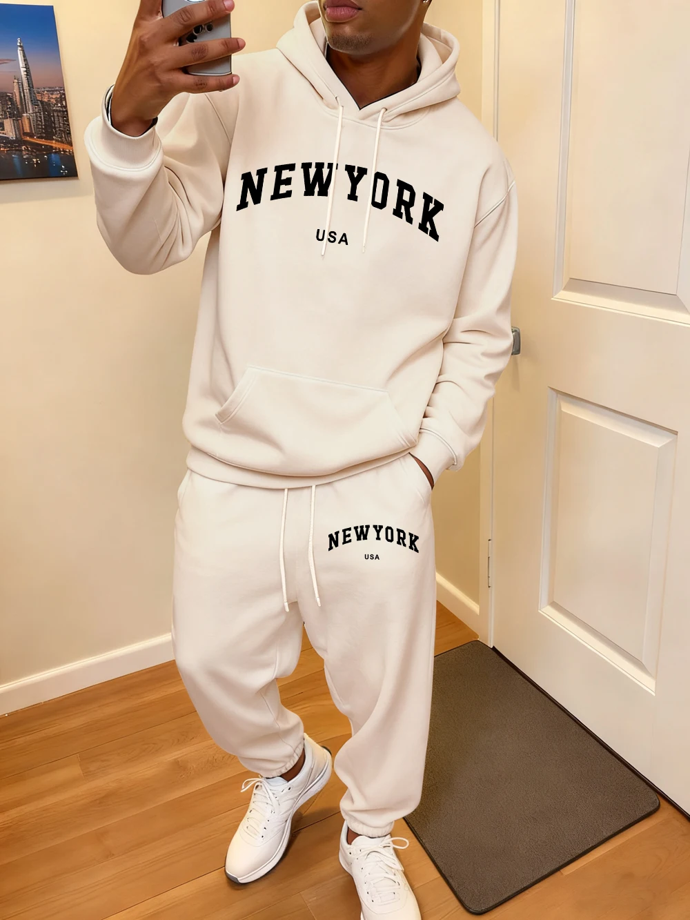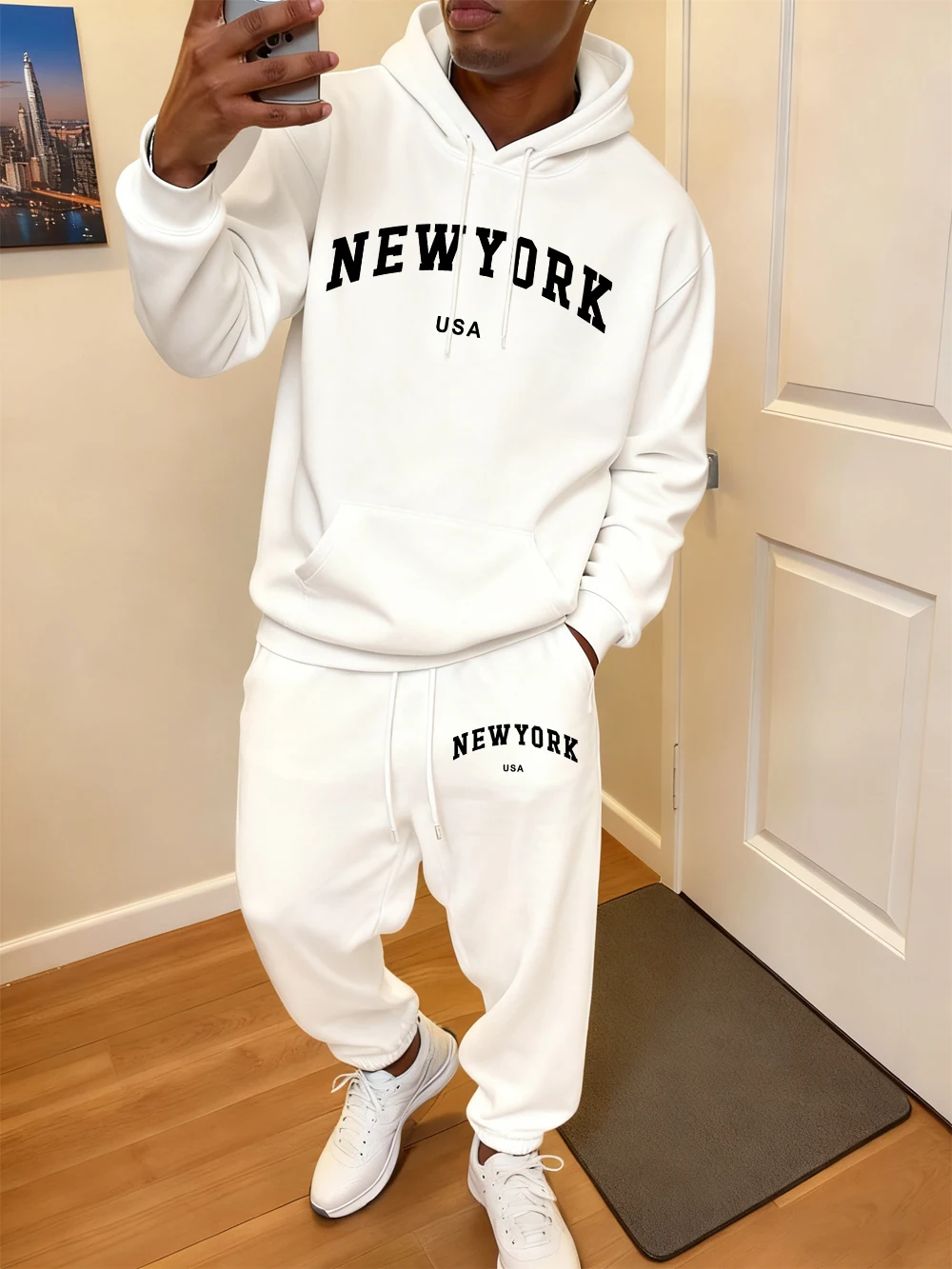 2 Pcs Hoodie Set Men'S New York Usa Letter Printed Sweatpants Casual Pocket Loose Hooded Sporty Pants Winter Fleece Warm Clothes